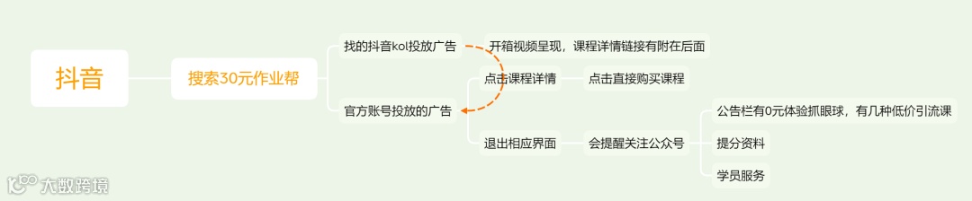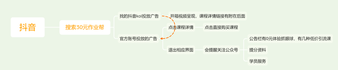 抖音渠道,不仅有自己的官方账号再宣传,也有投放一些几万粉丝的kol。视频做的也很精致,以下是抖音引流的路径从抖音直接卖课,不买课就引流到公众号从而形成了一个生态的闭环。