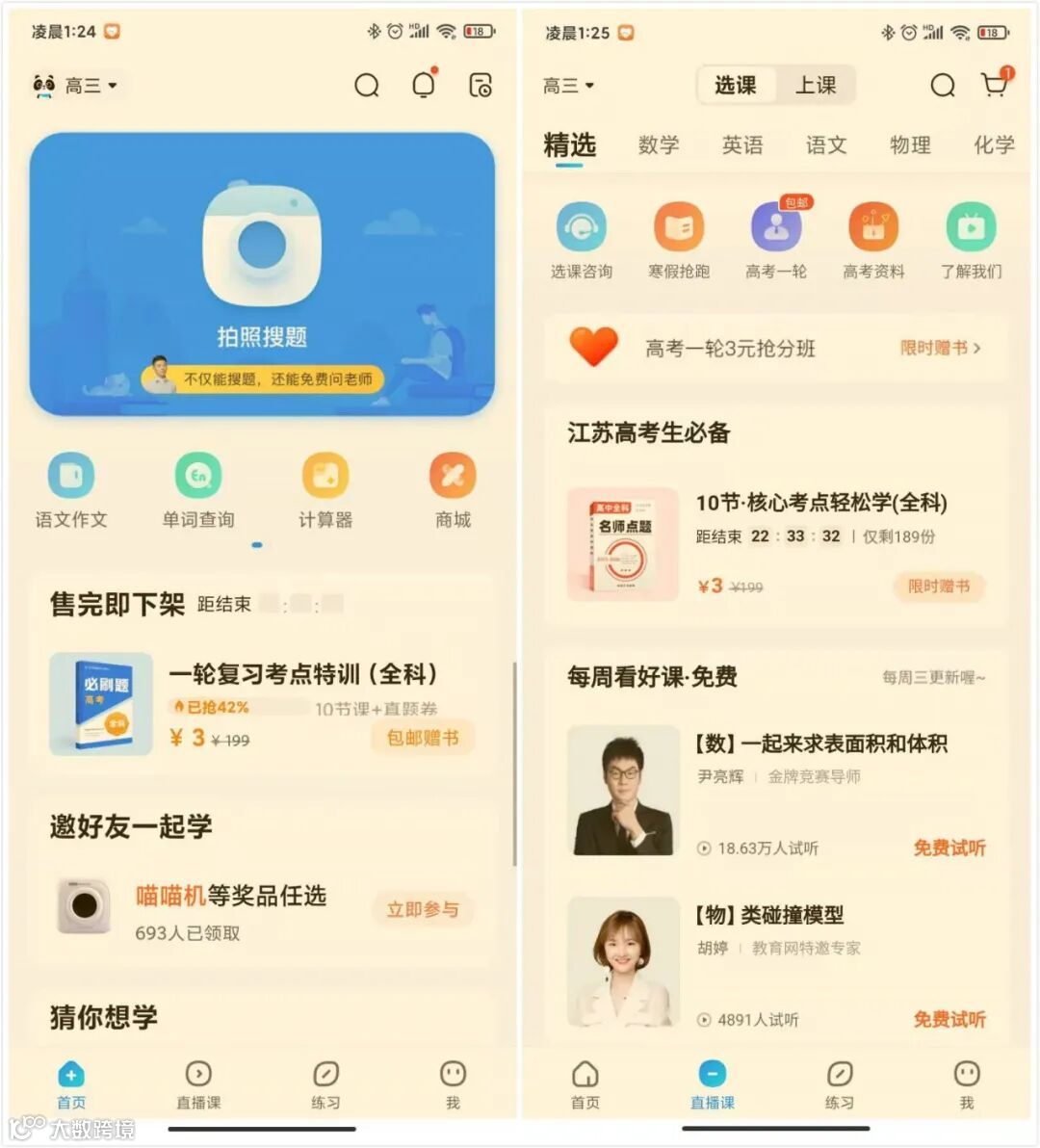 a.首页最上的拍照搜题功能,其余页面最终都为直播课引流