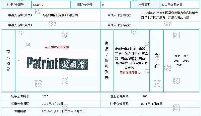 诉争商标由爱国者Patriot构成,由飞毛腿公司于2010年5月24日向国家工商行政管理总局商标局(简称商标局)提出注册申请,注册号为8322472,指定使用在第9类的衡器、电脑计量加油机、光导丝(光学纤维)、避雷器、电池充电器、电池、移动电源(外挂电池或后备电池)商品上。该商标专用期限至2021年11月20日。