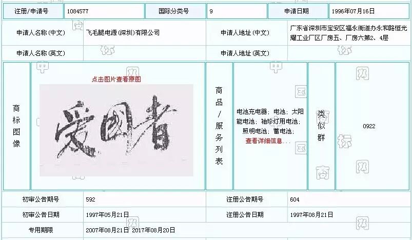 第1084577号爱国者商标(简称第1084577号商标),申请日为1996年7月16日,核定使用在第9类的电池充电器、电池、太阳能电池、袖珍灯用电池、照明电池、蓄电池商品上。该商标专用期限至2017年8月20日,目前商标权人为飞毛腿公司。