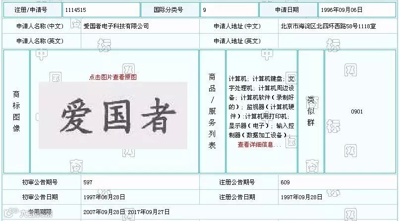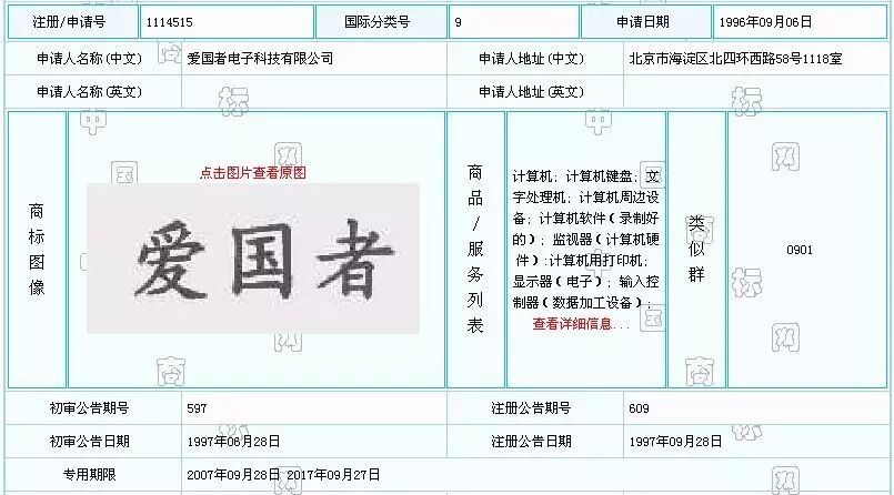 引证商标由爱国者构成,申请日为1996年9月6日,注册号为1114515,核定使用在第9类的计算机、计算机键盘、计算机周边设备、计算机软件(录制好的)、监视器(计算机硬件)、计算机用打印机、输入控制器(数据加工设备)、文字处理机、显示器(电子)商品上。该商标专用期限至2017年9月27日,目前商标权人为爱国者公司。