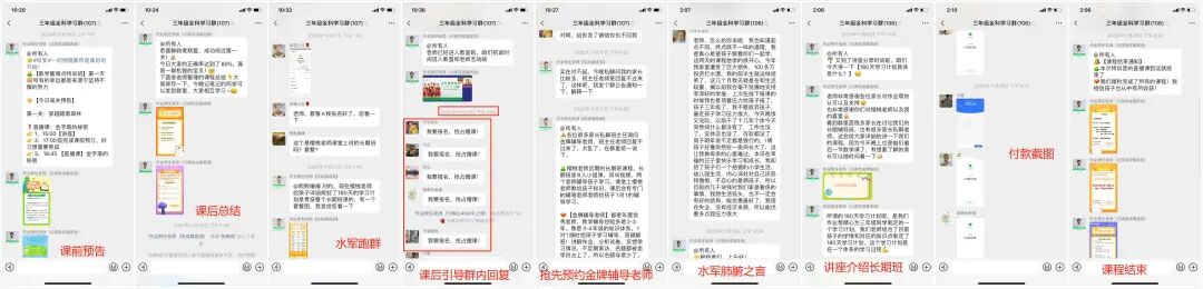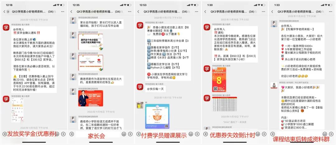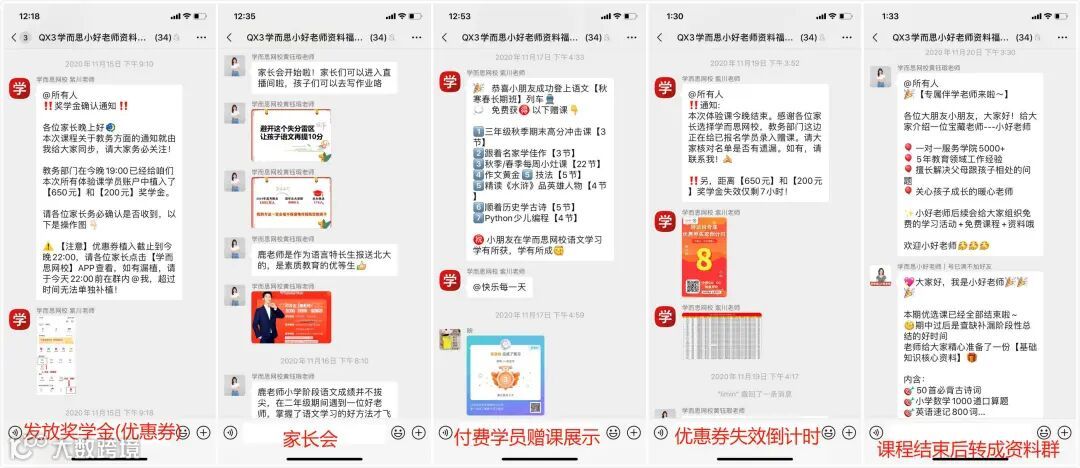 多人配合:邀请教务老师进群,两人打配合,班主任老师负责课程提醒,教务老师负责优惠券、赠课事宜,主讲老师做宣传,水军跑群