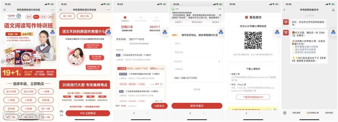 很明显,学而思网校卖课就是主打赠课这个诱饵,用19.9元筛选一波稍微精准流量,通过7天的社群运营+课程体验,来转化正价秋寒春长期班。
