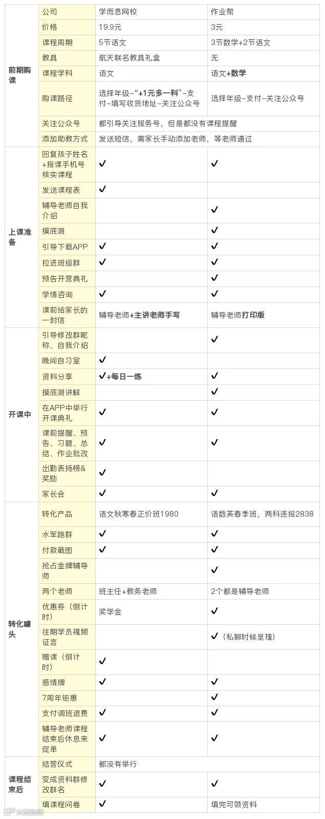对比作业帮,价格是3元也没有教具,虽然是双科,但是群内和私聊转化氛围没有学而思网校的浓厚,没有优惠券和赠课倒计时,私聊主打诱饵是金牌辅导教师和优惠券倒计时。上课是有雪球这个IP,故事线串联。