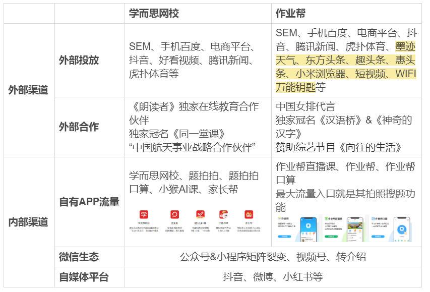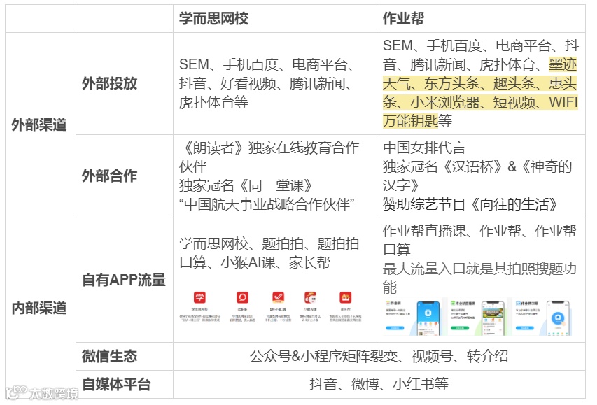 猿辅导和作业帮的大部分流量来自于自己的工具产品、投放、广告和微信生态,其中微信生态做的不算很好,微信生态做的最好的是跟谁学。