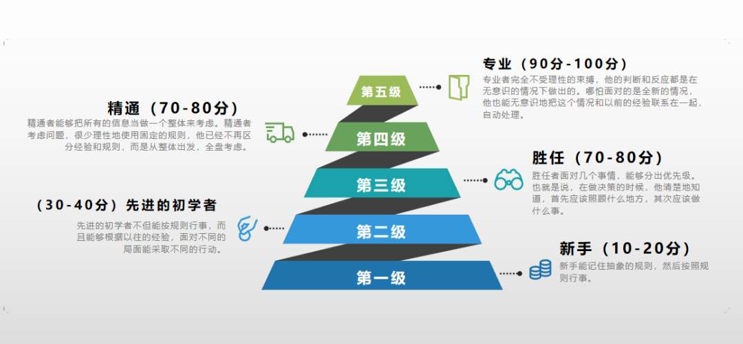 那么,我们来看一下“德雷福斯模型”,把打怪升级的成长过程分为五级。