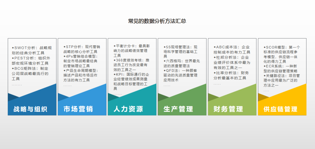 数据分析方法其实有很多,包含战略与组织、营销、人力资源、生产管理、财务管理、供应链管理等等方面。