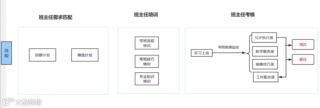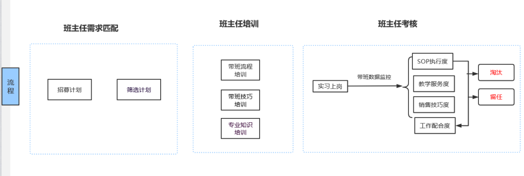 培训环节:涉及到三个维度,比如带班流程这块(特别是SOP)的培训,带班销售技巧这块的培训;以及专业知识点(或者也说高阶课了解度)的培训。