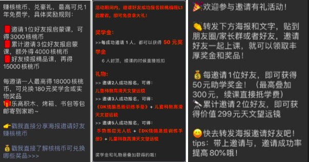 任何在线教育公司都会花钱推广产品,这不在转介绍的拆解范畴,因为其对转介绍的影响微乎其微,用户能有心思看完你的产品介绍就不错了,不会想到你还有邀请有礼这样的好事(拼团在投放端属于促销策略,可以不算老带新玩法)。