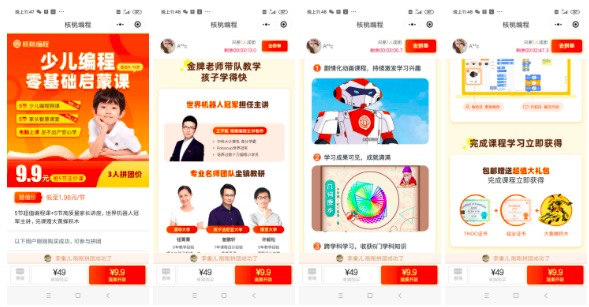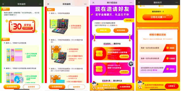 很多老带新产品是以流量品、体验品为主,核桃编程也不例外,它的老带新是围绕9.9元体验课设计的。该产品由5节编程课+5节家长讲座组成的训练营课程,以体验为主,有专门的助教跟踪服务,包括建群答疑、一对一催课等,上课模式是录播+电脑操作,因为编程需要专门软件来学习,会给学生很强的好奇感,而且效果容易看见,因为是操作性的内容学习,这为传播和转化降低了运营门槛。