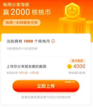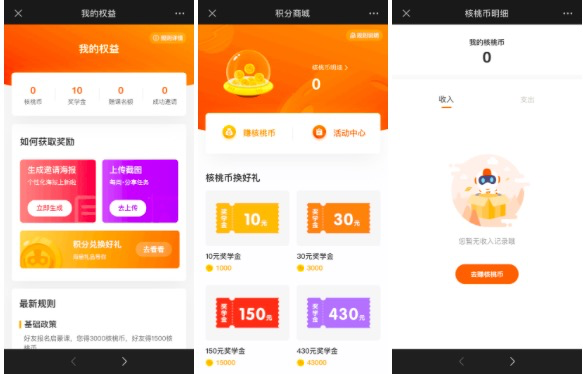 菜单栏【邀请有奖】-子菜单【积分商城】-赚核桃币/活动中心