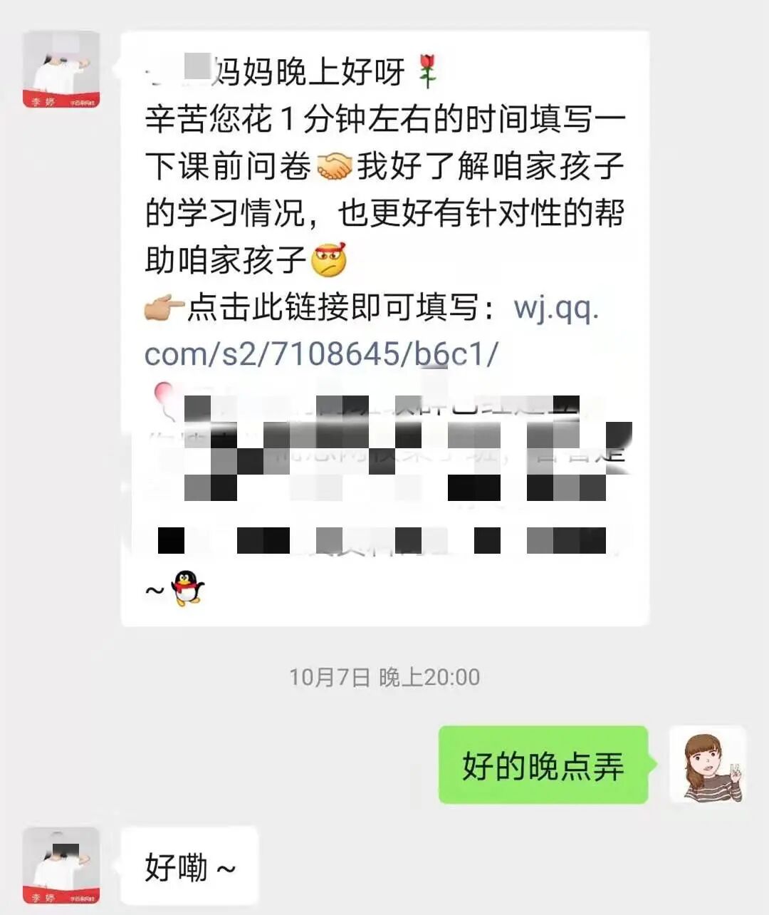 直到后来,这位老师给我强调了入群的重要性:将在群里发资料,不进群,孩子收不到资料;看到这里,我立即入了群。