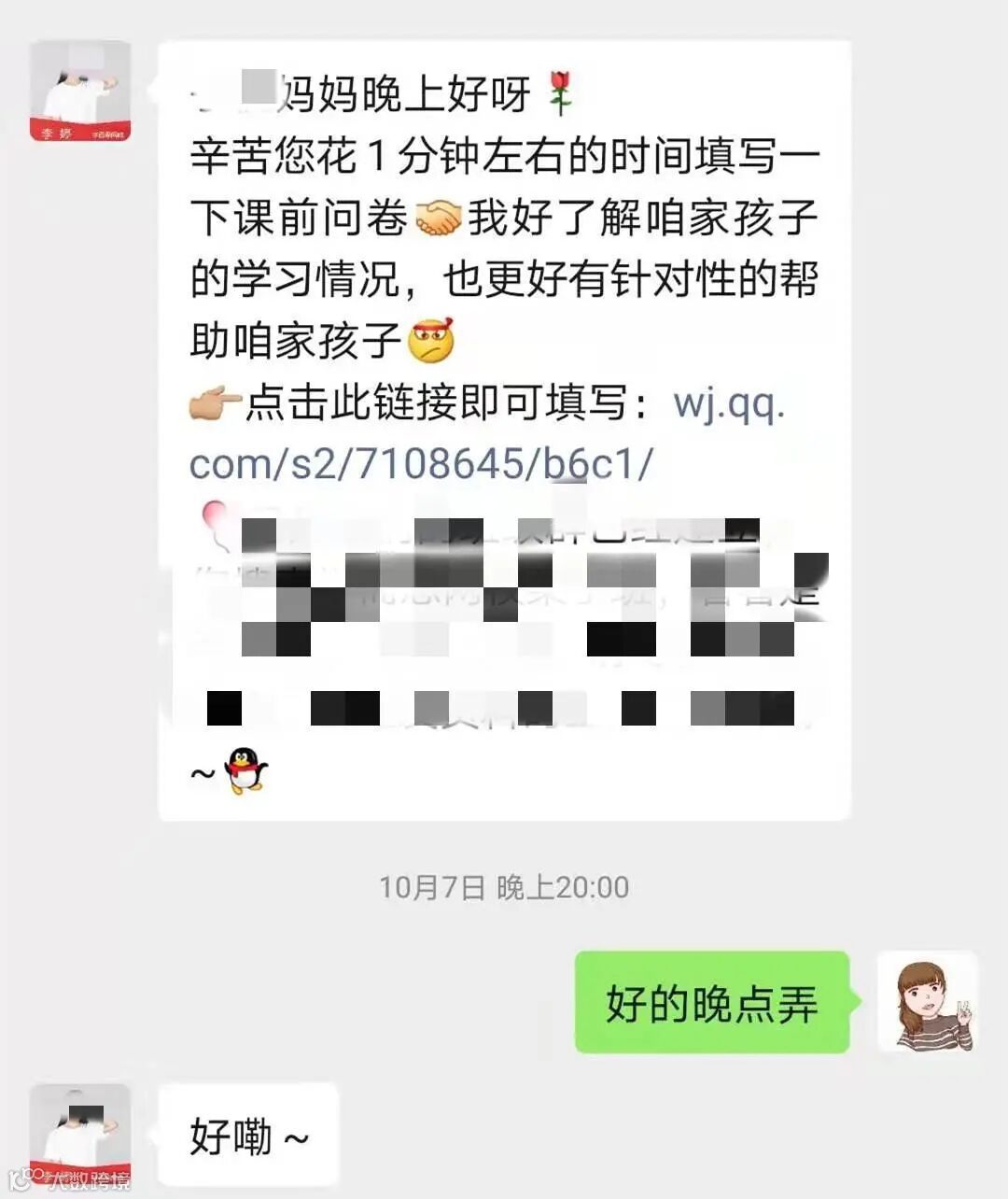 为了进一步吸引家长对引流课的期待,为后续的正价转化做铺垫,在开课前第2天,老师给我发来了一个学情测评: