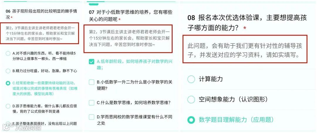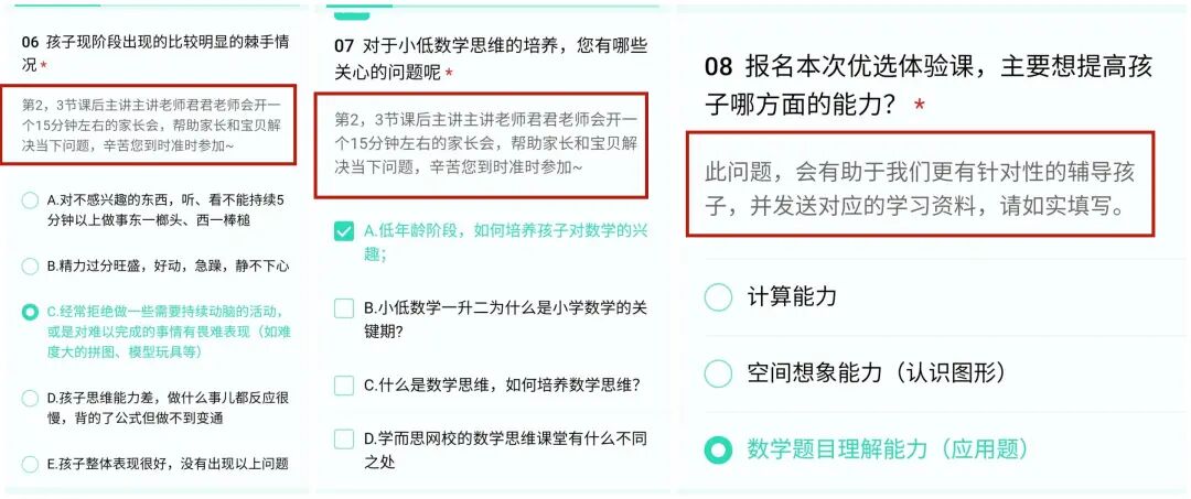 值得一提的是,为了提高问卷完成率、提升用户粘性,学而思在一些关键问题后面,都做了原因阐释,比如在棘手情况这里,抛出了家长会,为后期转正价课埋下伏笔。