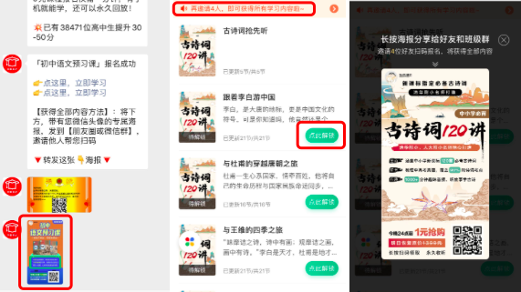 第二是整个路径有多个生成海报的入口,首先是关注公众号后的自然提醒,其次是返回听课页面后顶部展示的解锁提醒,以及未解锁产品的“点此解锁”的引导。
