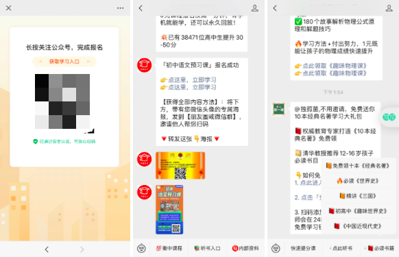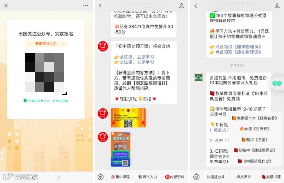 跟谁学的1元解锁和群裂变、任务宝一样,都是利用公众号矩阵相互倒流,基本逻辑很简单,就是在某个公众号的菜单栏、客服消息等位置展示解锁课程,这里面会利用文案的作用,包括课程名称,比如“免费领十本《经典名著》”,免费是直接动力点,经典名著是用户兴趣点,两点一起作用解决了注意力问题。