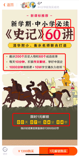 产品是流量产生的基础,跟谁学1元解锁的产品是面向K12群体的轻型内容,主要形式为音视频系列课,每个课程的讲次达到几十个,有一种内容充足的感觉,而且解锁价格为0元或1元,旁边还以几千元作为锚点,让用户感觉性价比十足,所以很容易完成付费。
