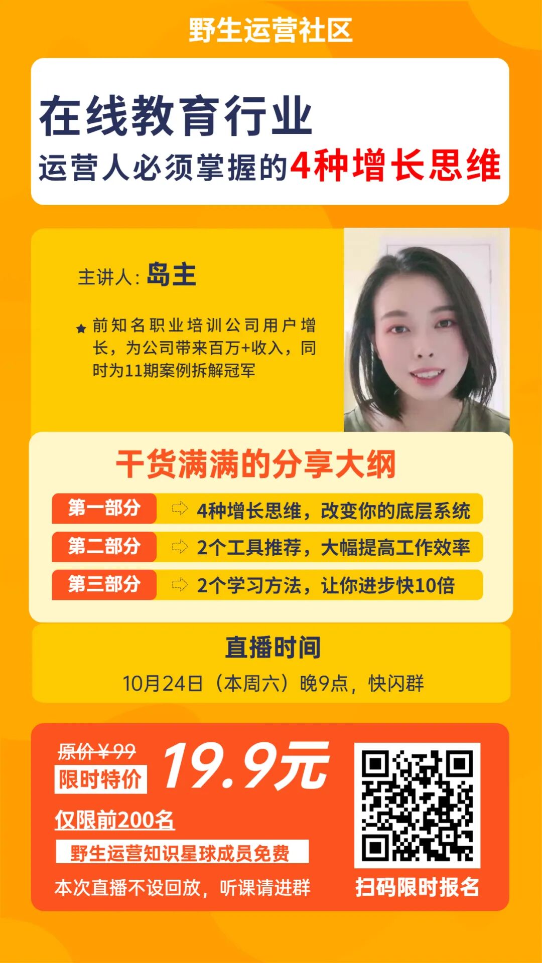 很多人好奇岛主是如何通过强大的框架体系,复原一个增长案例,并很想向她学习如何通过拆解,实现运营能力的提升。机会来啦,本周六(10月24日)晚9点,松月邀请了岛主跟你分享《在线教育行业,运营人必须掌握的4种增长思维》,强烈建议希望快速成长的运营人来听课,本次分享不设回放,扫码报名↓↓↓