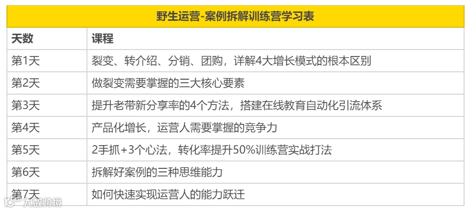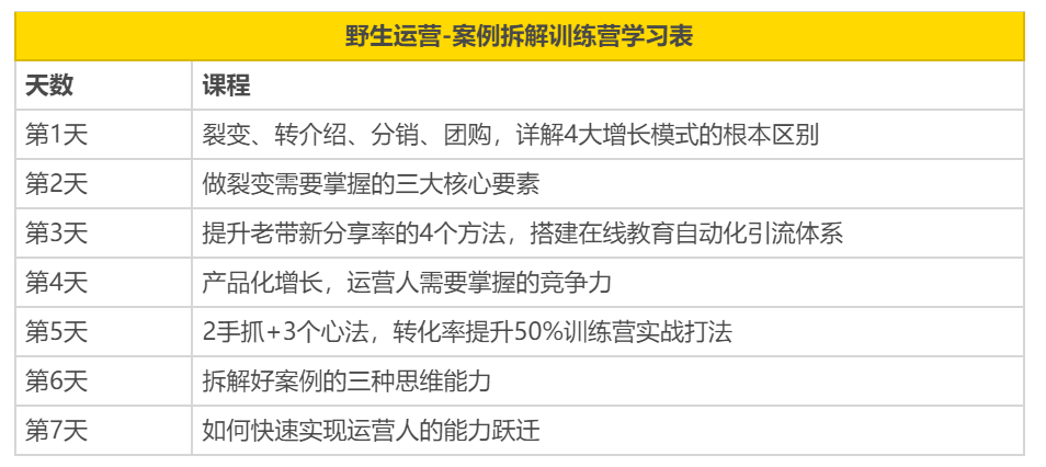 拆解案例活动的最终目的,不是让大家拆解越来越多的案例,而是通过对有限案例的拆解,获得增长底层能力,所以野生运营『案例拆解』这7天的课程是这样安排的:
