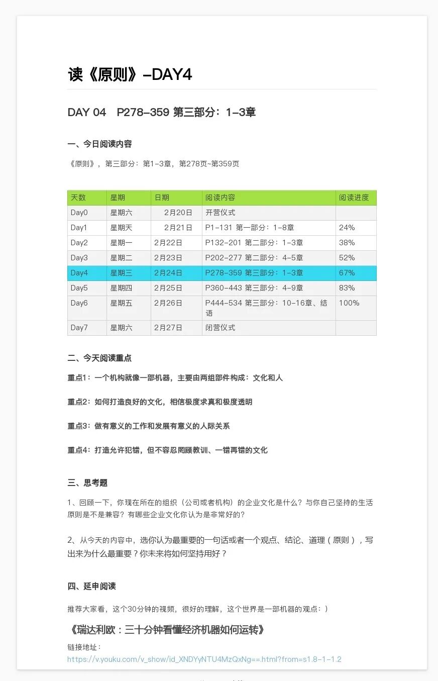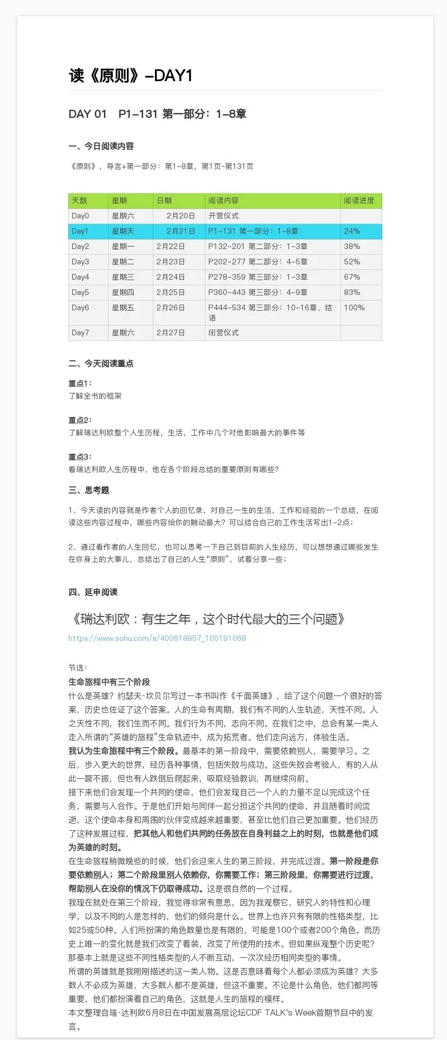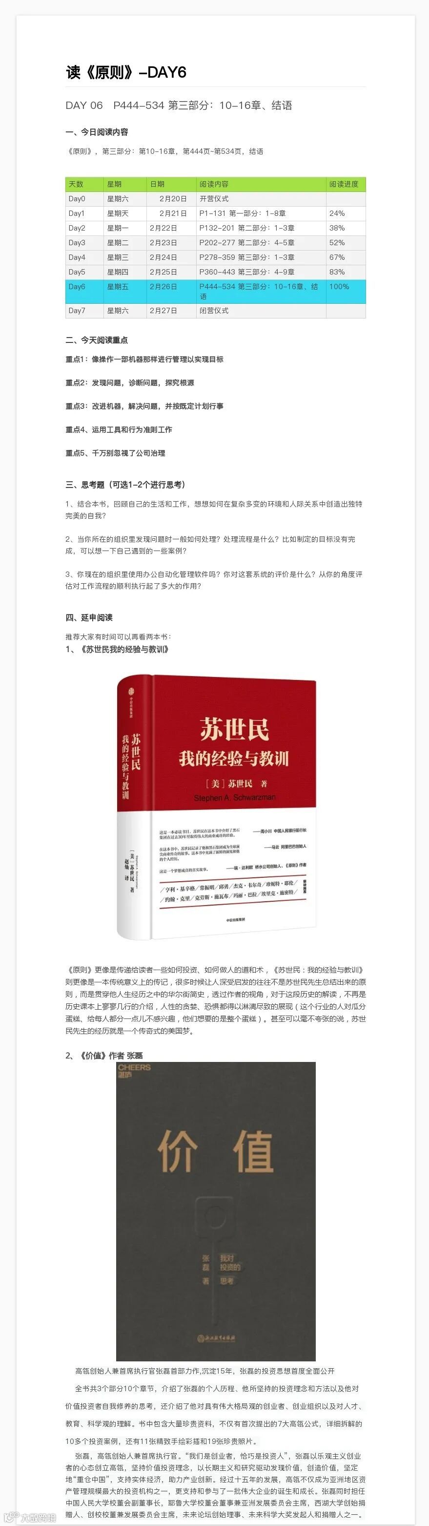 2月21日-2月27日,野生运营读书会结束了第 27 本书《原则》的共读,7 天时间领读人金大哥带大家读完了全书精华部分。感谢金大哥的7天领读,《原则》这本书是一本你遇到了,就会感到相见恨晚的书,也是一本值得二刷三刷的好书,未来读书会也会按照大家的需要再次带领阅读此书。