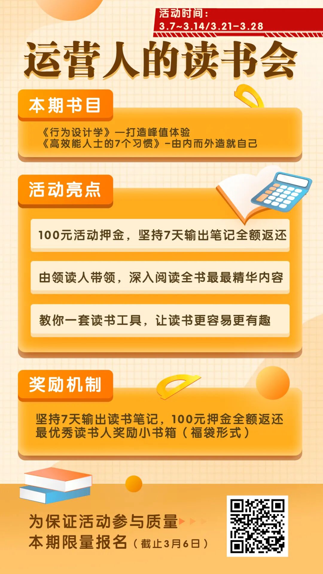 下期读书会我们一起共读《行为设计学》和《高效能人士的7个习惯》,报名截止今晚 20 点,想通过读书提升自己认知水平的小伙伴,扫码了解活动及报名: