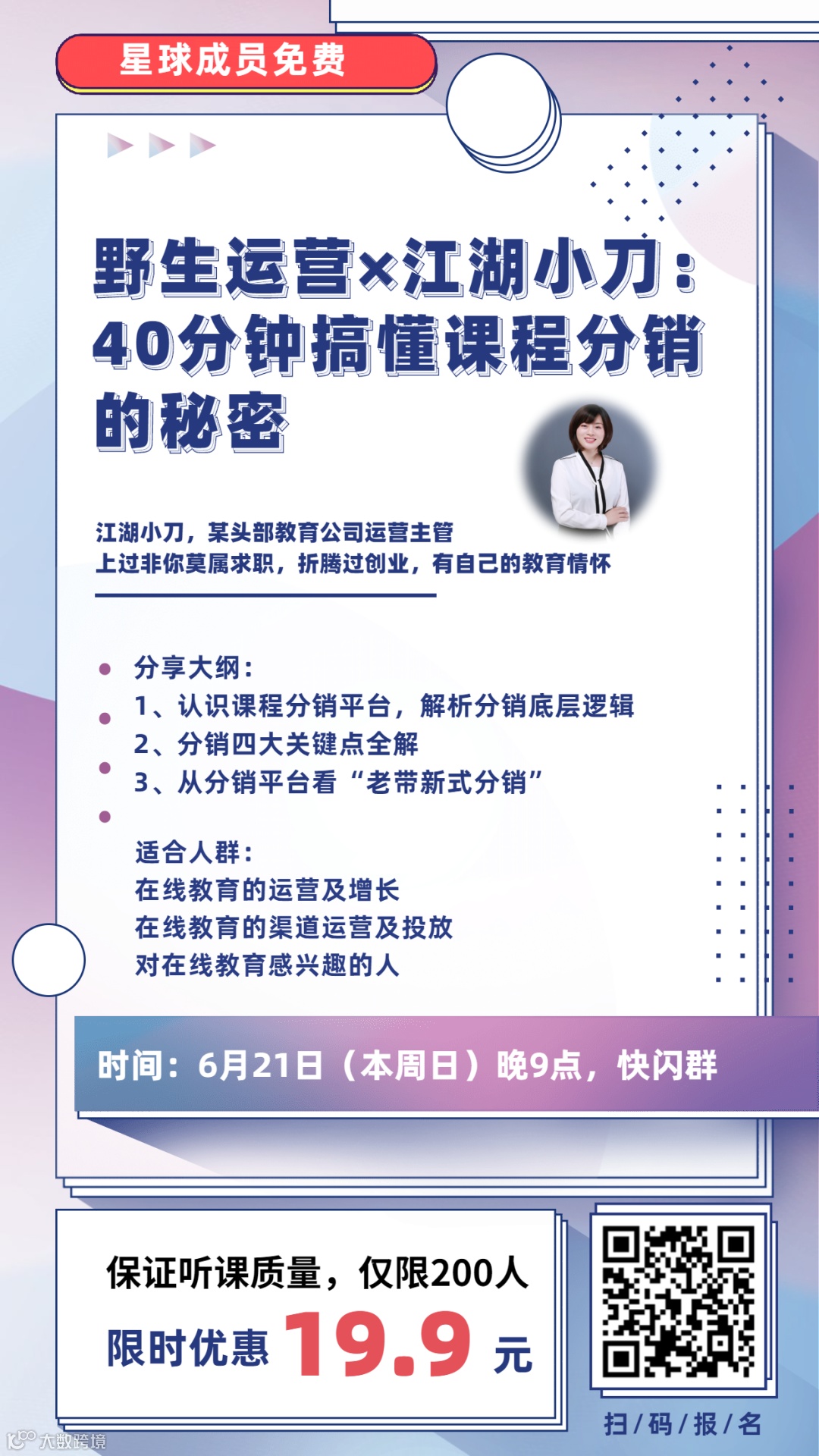 松月又来发布学习通知啦,本周的集体学习,松月邀请来江湖小刀,某头部教育公司运营主管,带来分享《40分钟彻底搞懂课程分销的秘密》,扫码报名(报名截止6月21日晚8点,过期报名不拉群):