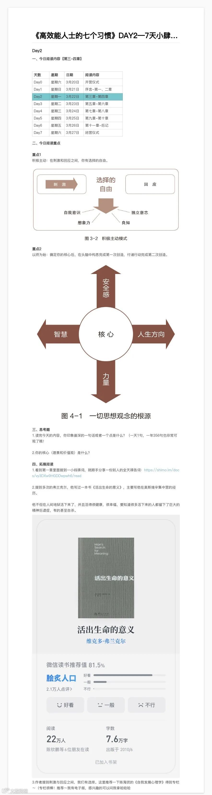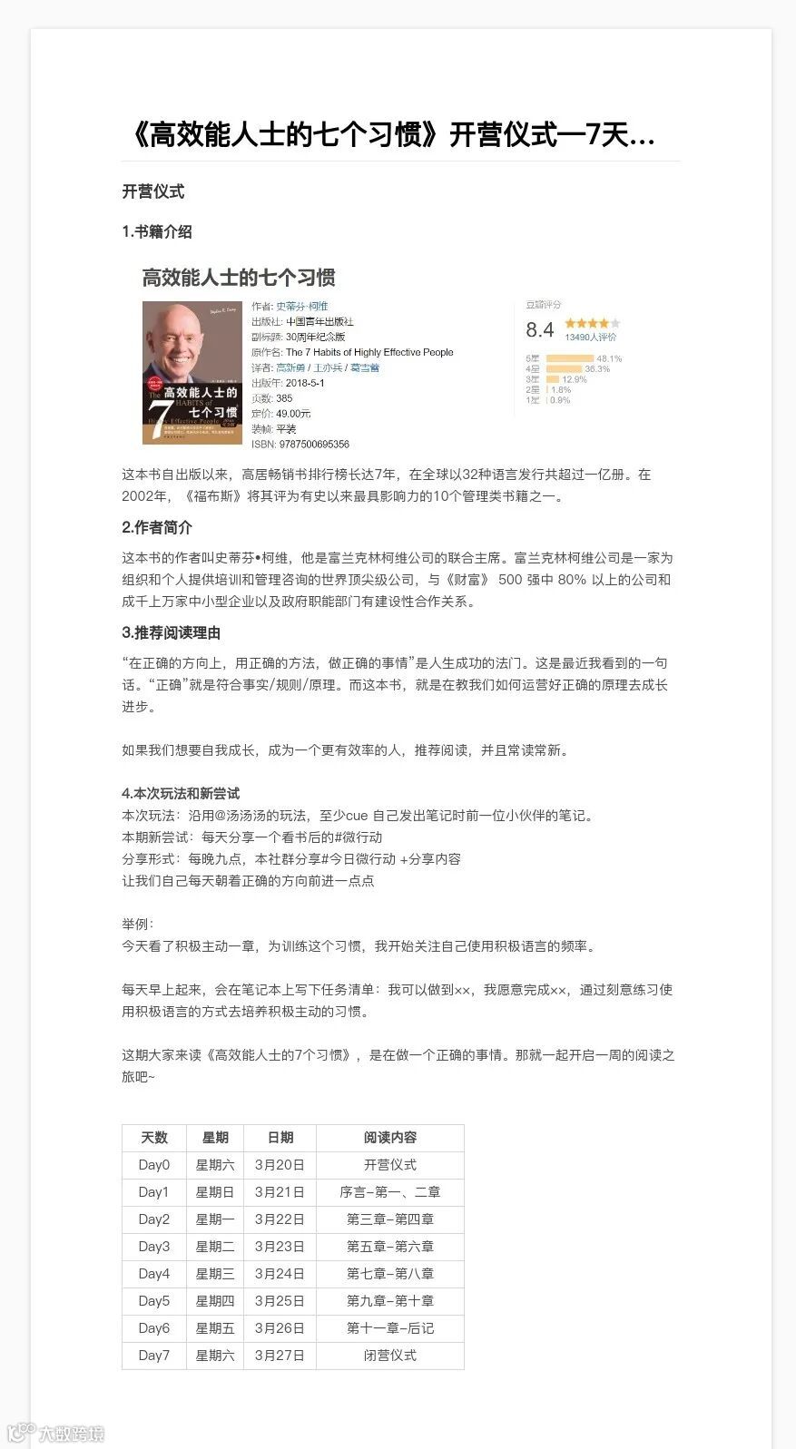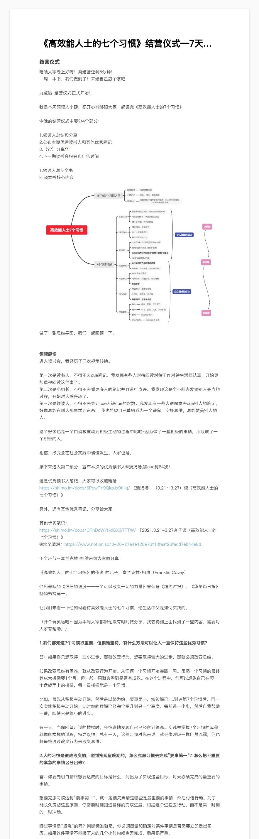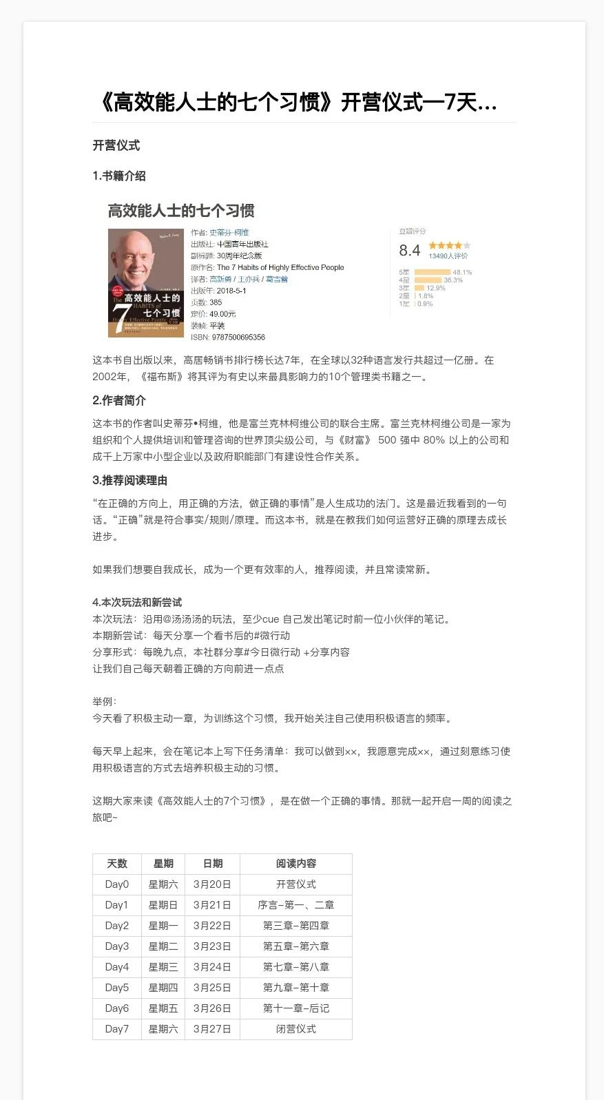 3月21日-3月27日,野生运营读书会结束了第 29 本书《高效能人士的7个习惯》的共读,7 天时间领读人小肆带大家读完了全书精华部分。感谢小肆的7天领读,在这个越来越忙碌的当下,我们需要的不是“挤时间”,而是聚焦要事,用书中提到的7个习惯,帮我们提升效率,过自由的人生。