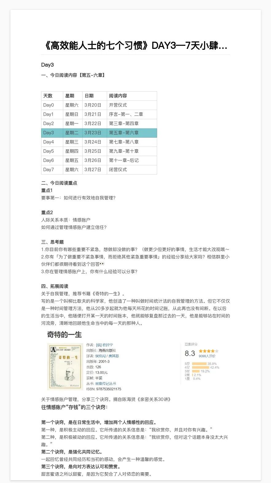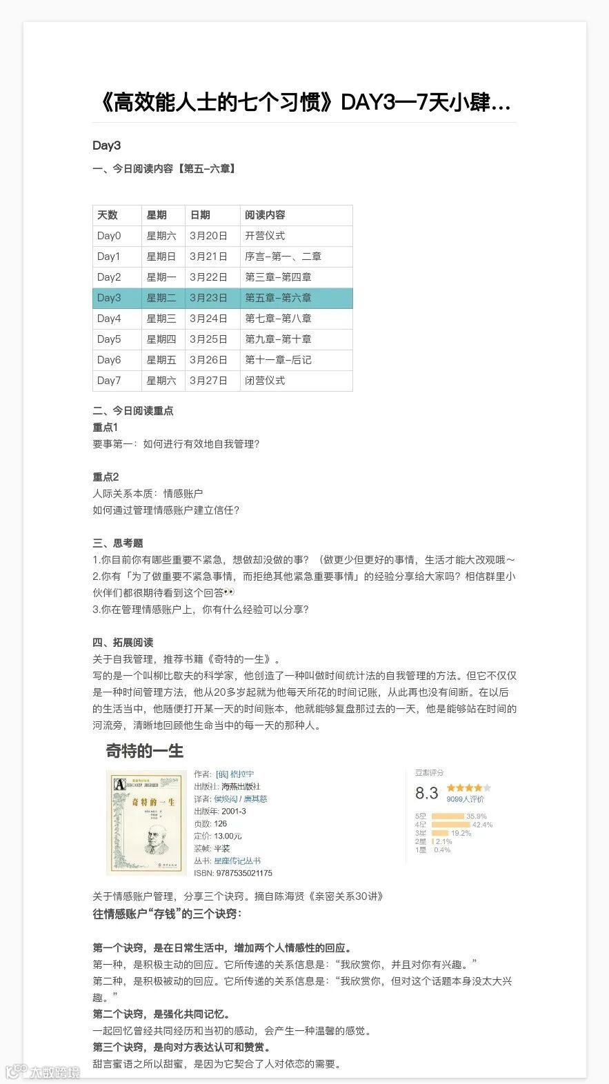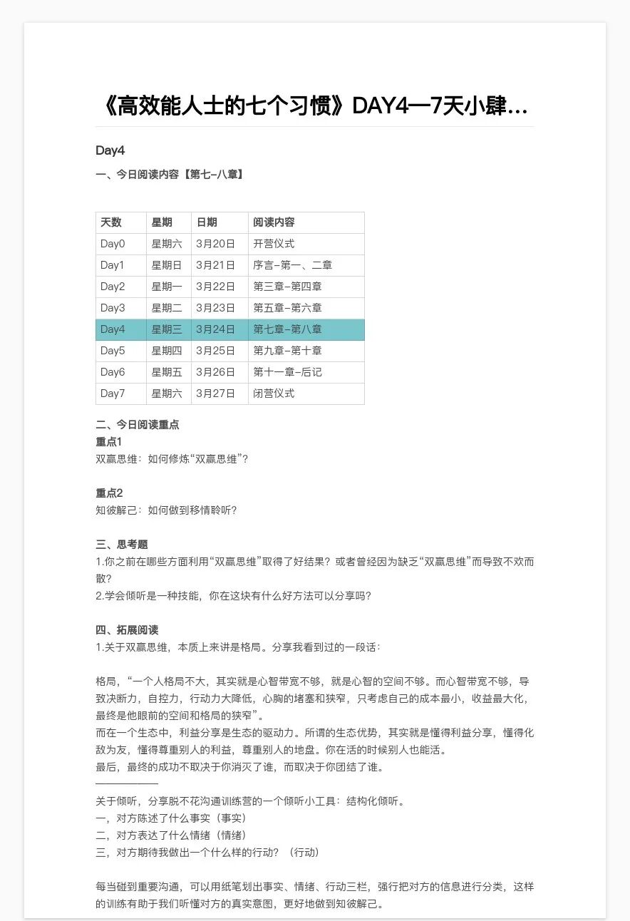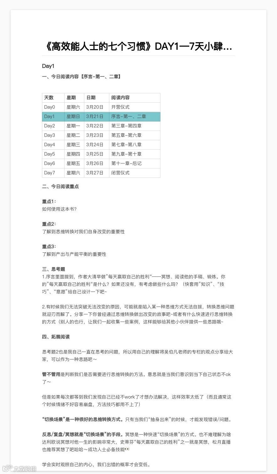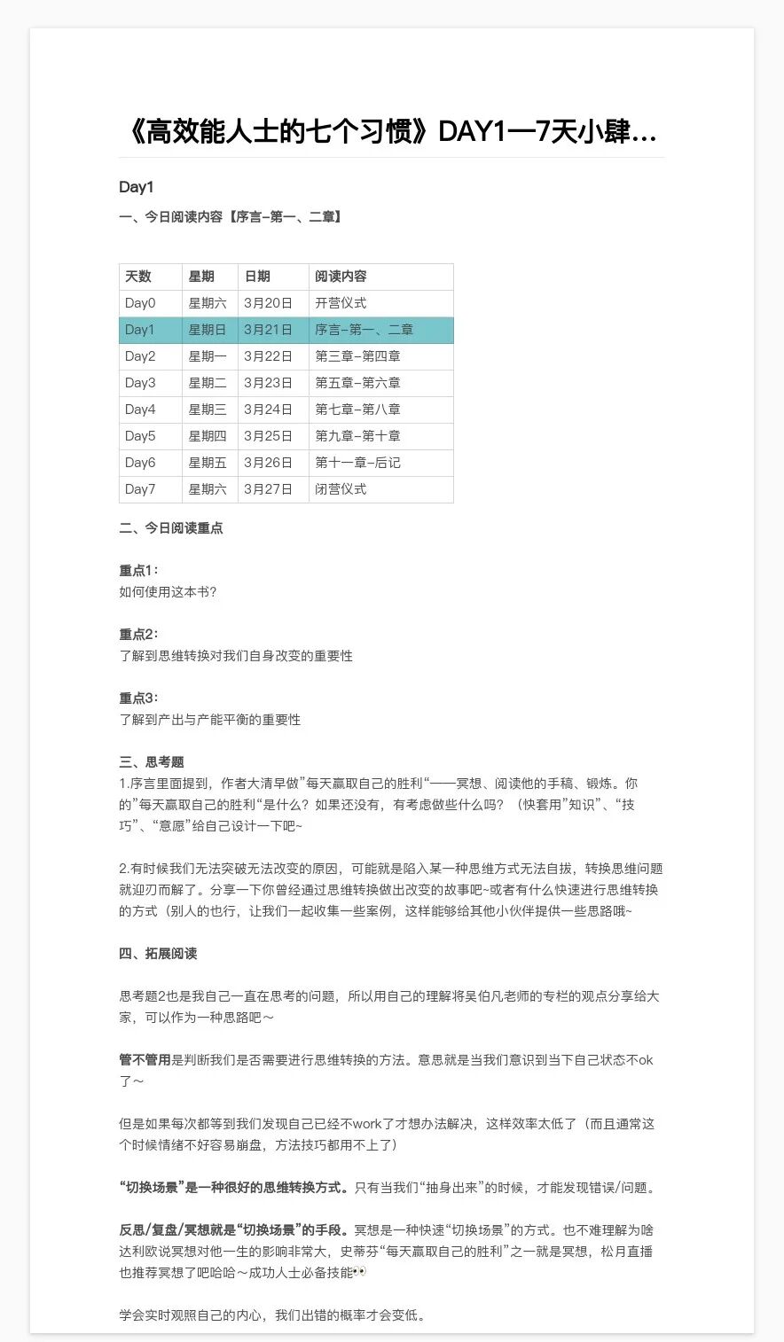 3月21日-3月27日,野生运营读书会结束了第 29 本书《高效能人士的7个习惯》的共读,7 天时间领读人小肆带大家读完了全书精华部分。感谢小肆的7天领读,在这个越来越忙碌的当下,我们需要的不是“挤时间”,而是聚焦要事,用书中提到的7个习惯,帮我们提升效率,过自由的人生。