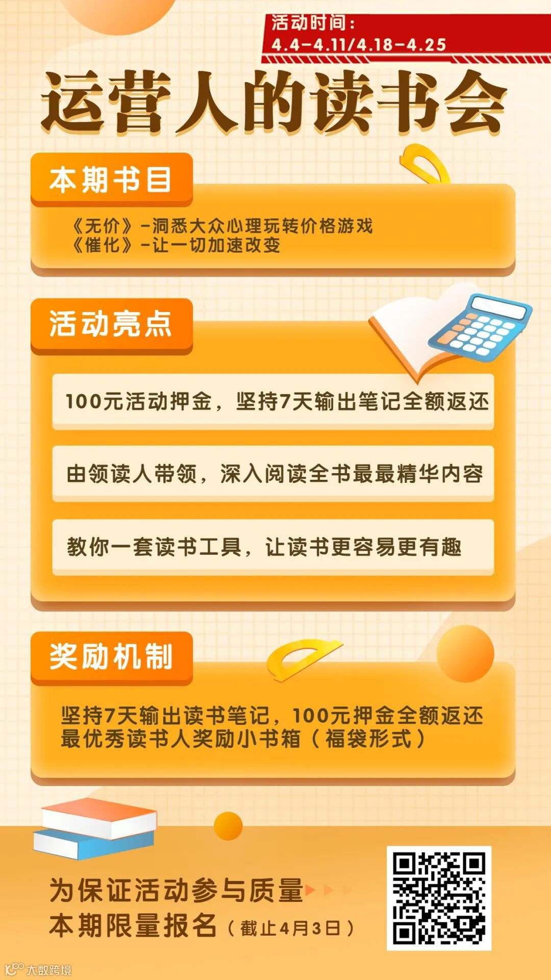 下期读书会我们一起共读《无价》和《催化》,报名截止今晚8点,想通过读书提升自己认知水平的小伙伴,扫码了解活动及报名: