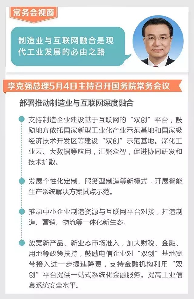 当天会议部署推动制造业与互联网深度融合,加快“中国制造”转型升级。
