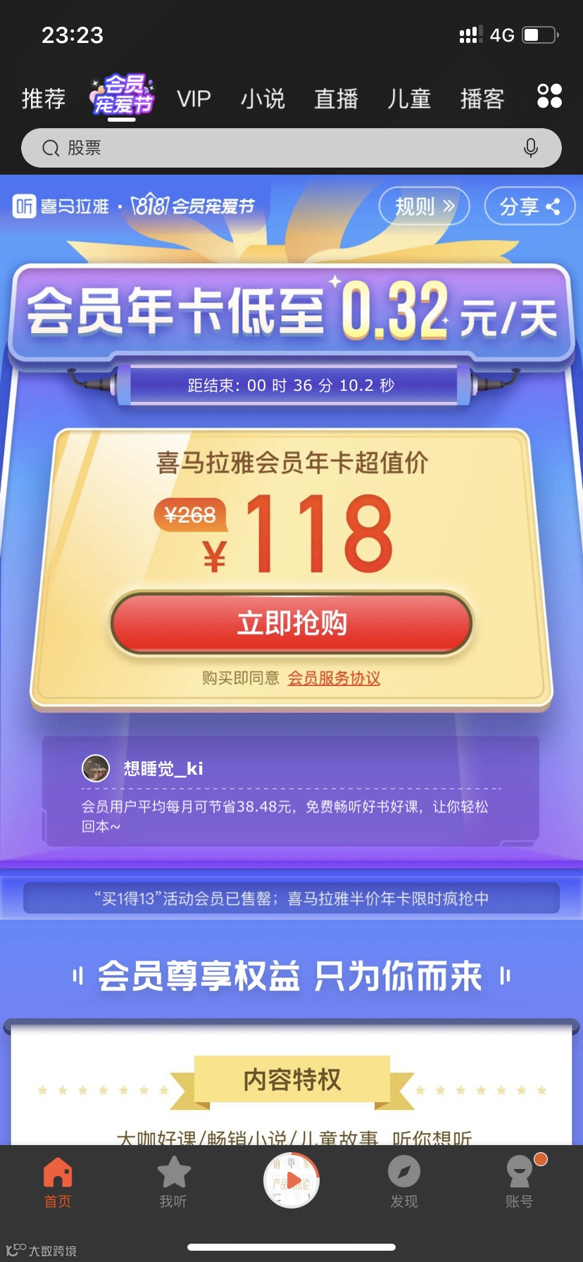 19号23:00多,“买1得13”活动会员售罄,活动提前结束。为了不让用户点进页面后发现活动结束失望,顺势推送喜马拉雅半价年卡活动引流转化,只要会员年卡只要118,低至0.32元/每天。