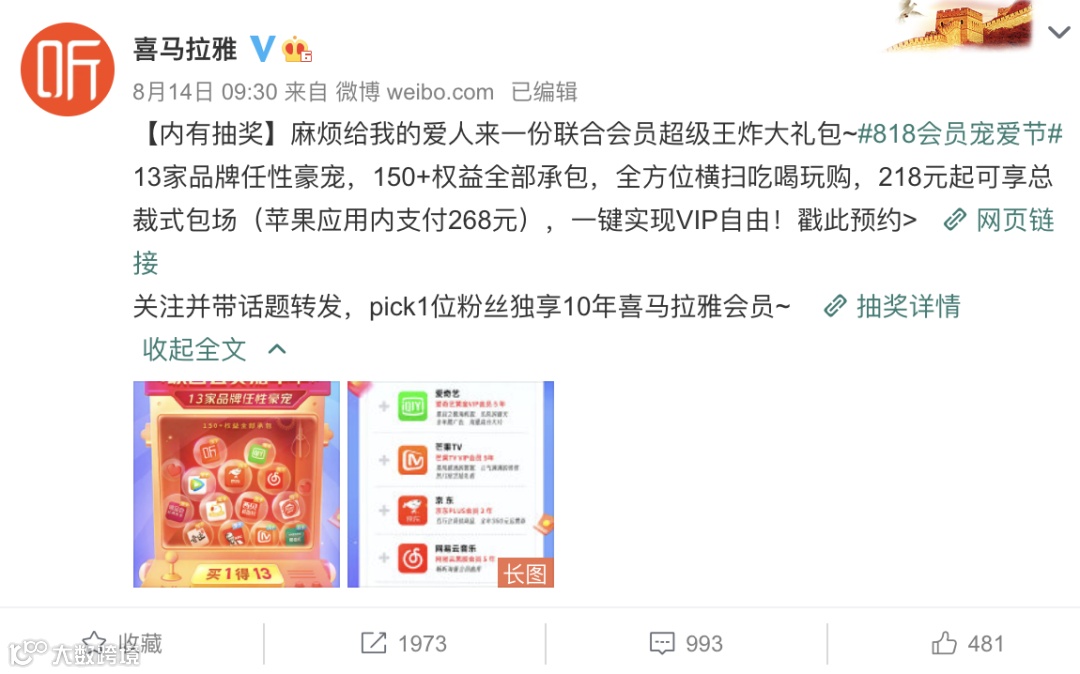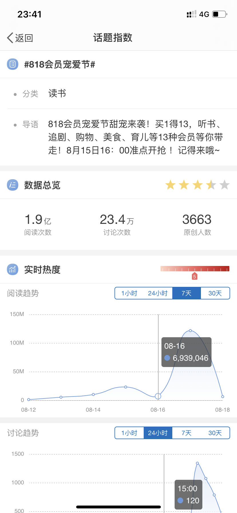 微博话题:#818会员宠爱节# 阅读次数1.9亿,讨论次数23.4万,覆盖面广