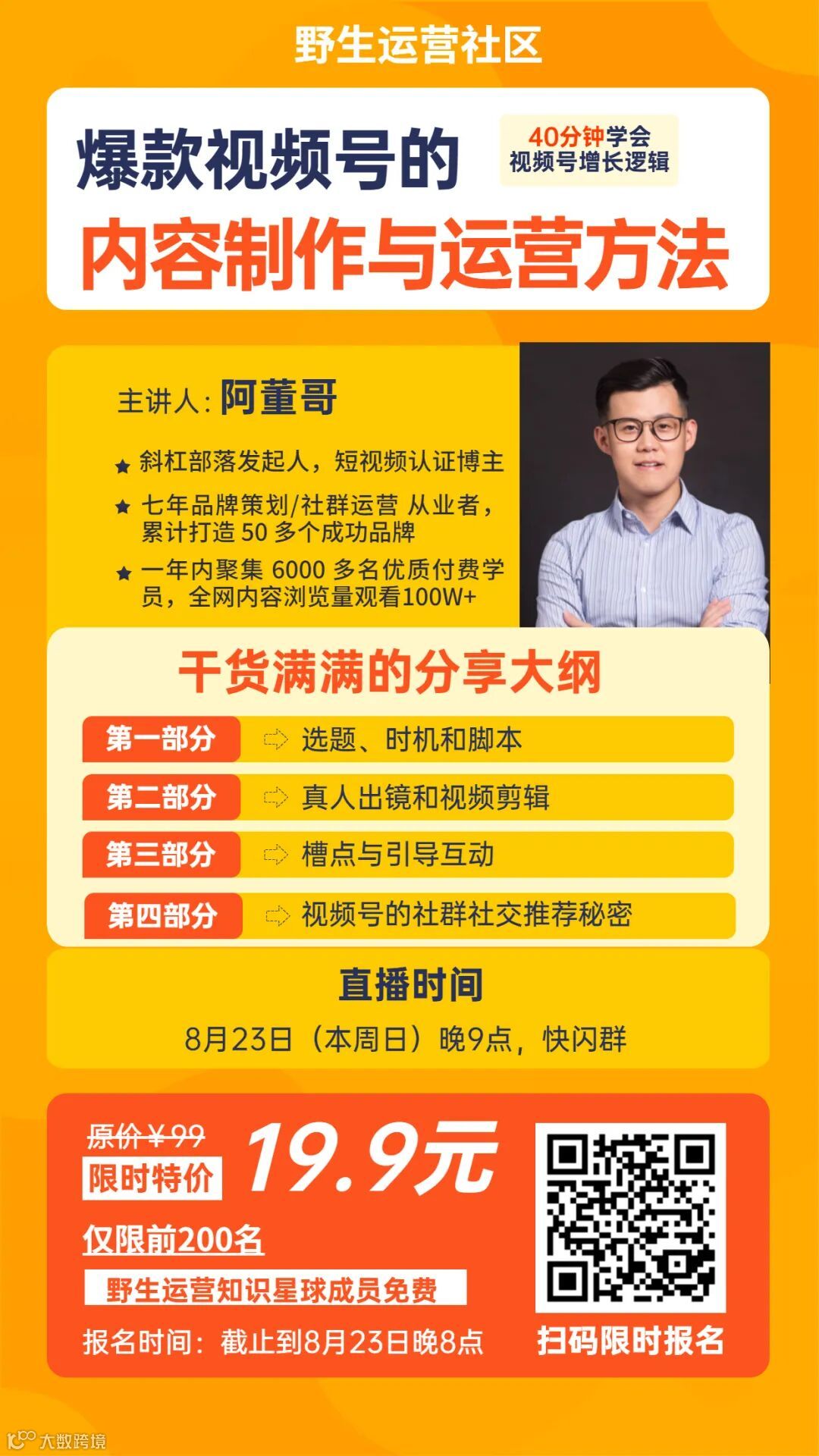 本周日晚9点,松月邀请了斜杠部落发起人、短视频认证博主阿董哥,跟大家分享《爆款视频号的内容制作和运营方法》。