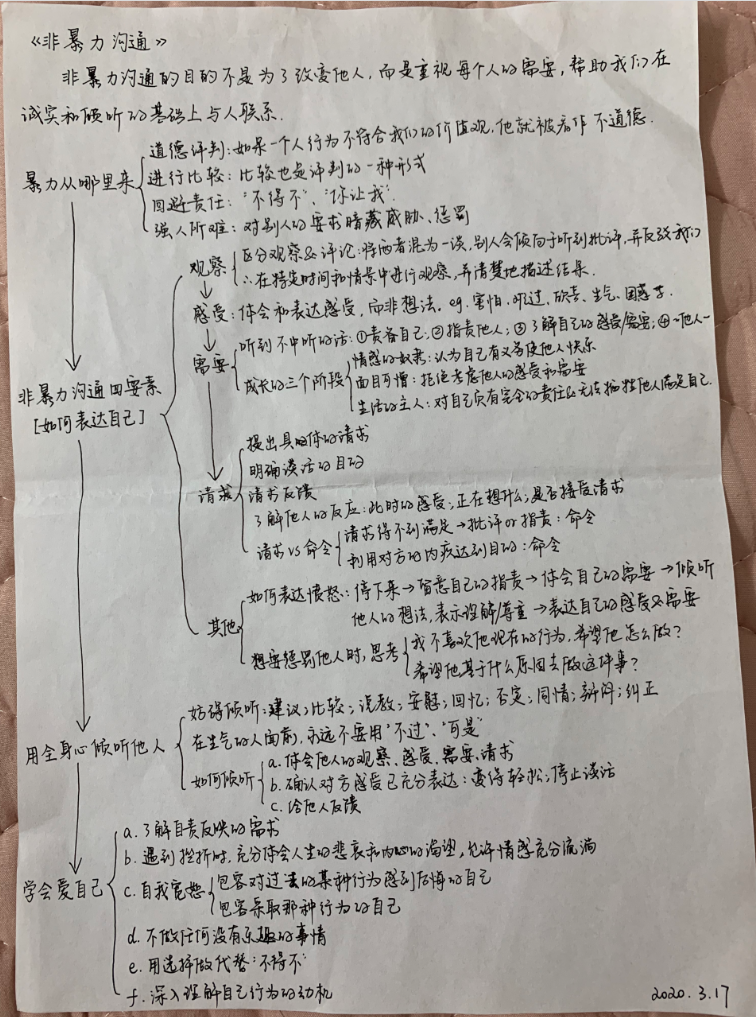 暴力的来源、非暴力沟通是什么 → 如何通过非暴力沟通(四要素)表达自己 → 如何通过非暴力沟通倾听他人 → 学会爱自己