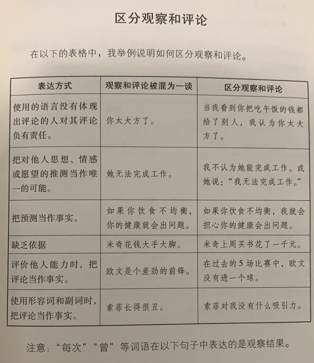 全书围绕这四要素进行:①什么是我的【观察】;②我的【感受】如何;③导致感受的那些【需要】是什么;④为了改善现状,我的【请求】是什么