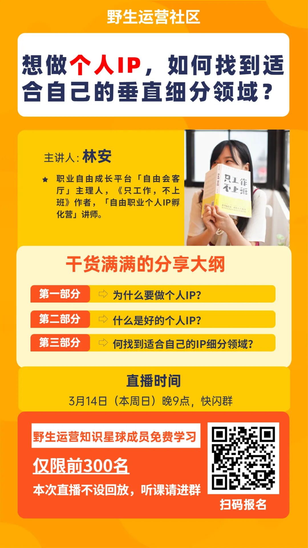 一直很喜欢微信公众平台的标语:再小的个体也有自己的品牌。在越来越不确定的时代,每个人都该活出一个公司的姿态,有自己的产品、有自己的圈子、有自己的影响力。本周日(3月14日)晚9点,我邀请了《只工作,不上班》作者林安跟你分享《想做个人IP,如何找到适合自己的垂直细分领域》,欢迎想要打造个人IP,或在个人IP打造上遇到问题的小伙伴来听课。