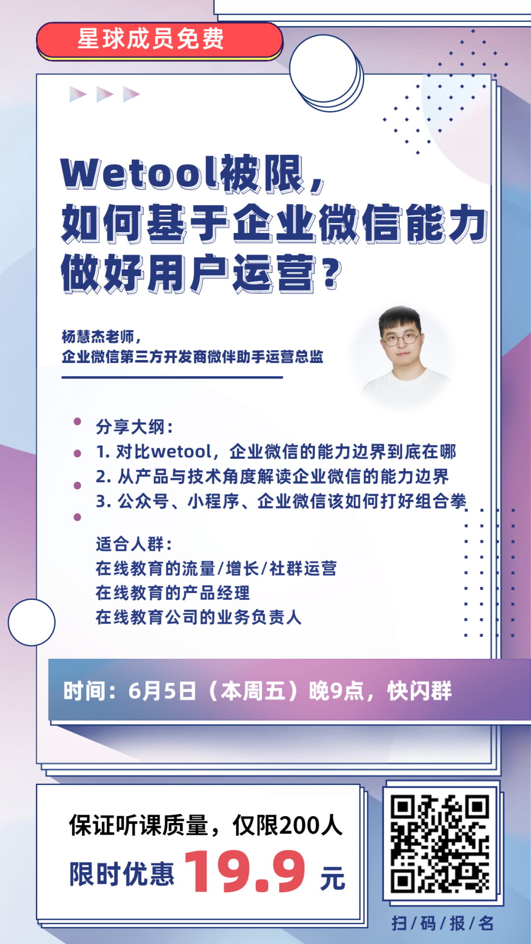 松月又来发布学习通知啦,本周的分享临时提前到周五!企业微信第三方开发商微伴助手运营总监杨慧杰老师,专场分享《如何基于企业微信能力做好用户运营?》,报名截止至本周五( 6月5日 )晚20点,过期报名不拉群,扫码报名: