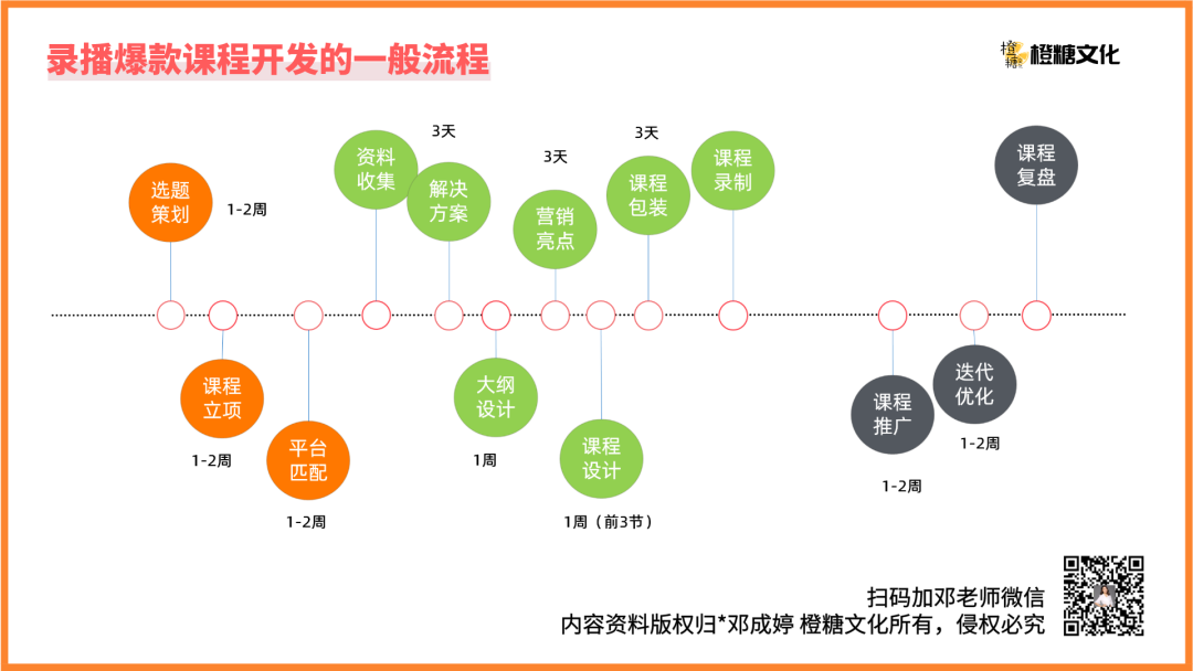 具体的步骤可以参考PPT,一共至少13个步骤:选题策划、课程立项、平台匹配、资料收集、解决方案、大纲设计、营销亮点、课程设计、课程包装、课程录制、课程推广、迭代优化、课程复盘。