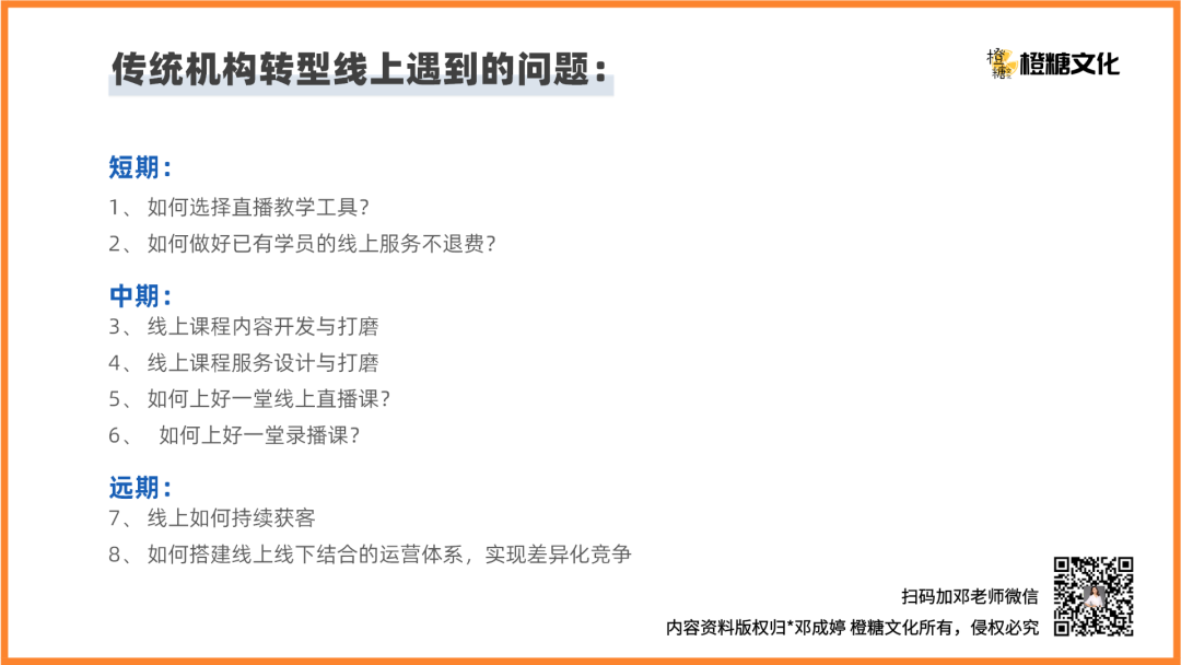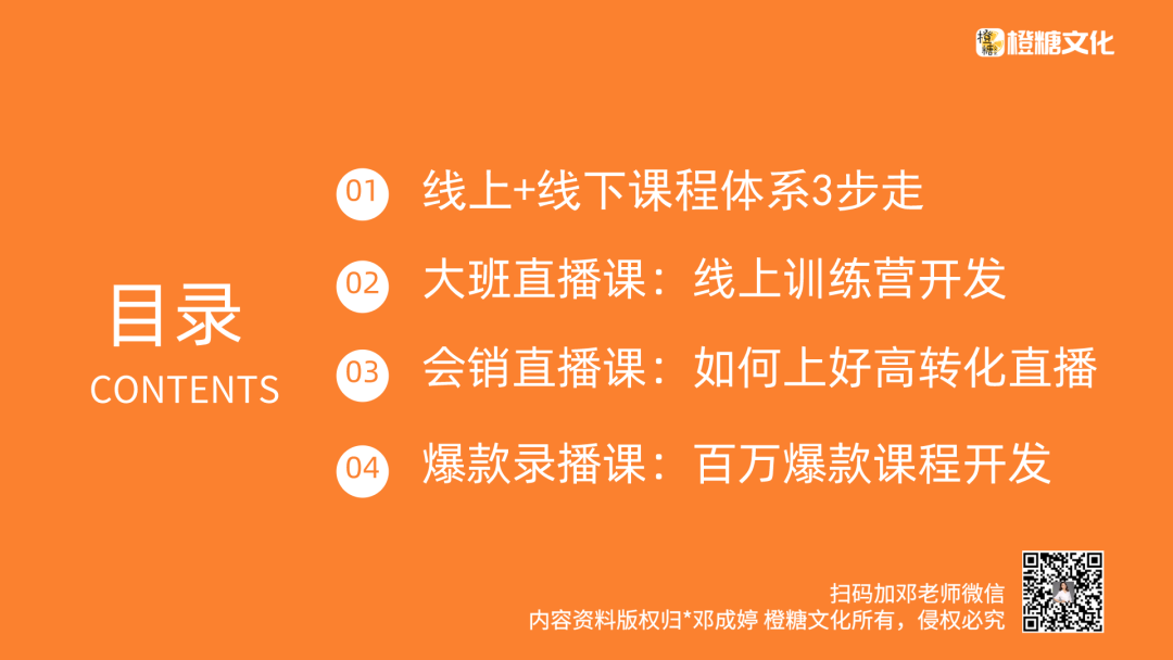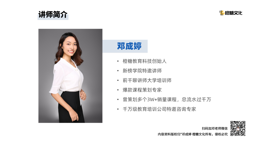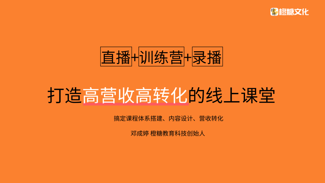 我是橙糖教育科技创始人,曾经帮助数十个线下传统机构和线下老师转型线上,从零打磨线上课程,搭建线上线下结合的直播课程体系和运营转化体系。