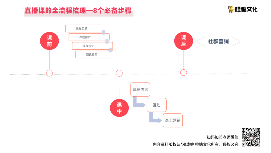 直播课的流程分为课前如何去准备,课中如何来上课,课后怎么去做承接三个部分。