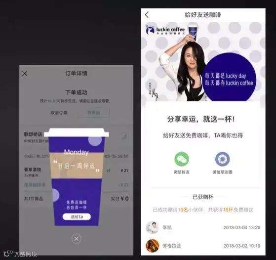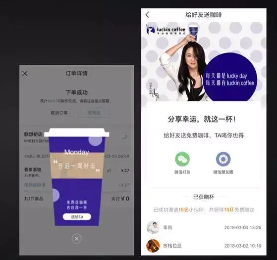 复利式的特点是互惠互利,比如luckincoffee的游戏化裂变玩法,和好友一起花式领券。
