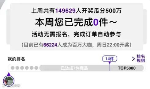根据观察,每周参与瓜分的人数在14万左右,除去5000人,剩下的13万5000人能分到的钱显然要比200低,所以,想要分更多钱,就进入前5000,至于办法就是多买产品多消费,这就是排行榜的套路。