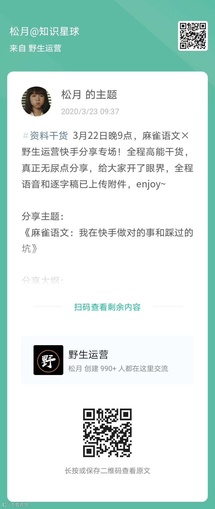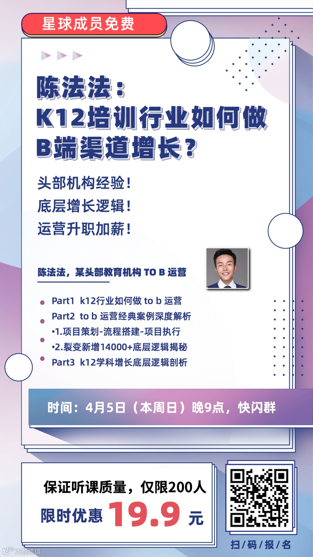本周日晚9点野生运营线上分享,请来了k12头部机构tob运营陈法法,给大家分享《k12行业如何做B端渠道增长》。他在今年2月运营了12个线上课程,裂变新增14000+,转化率20%+。文章《学科运营增长逻辑读后反思》被芥末堆转载,阅读4000+。