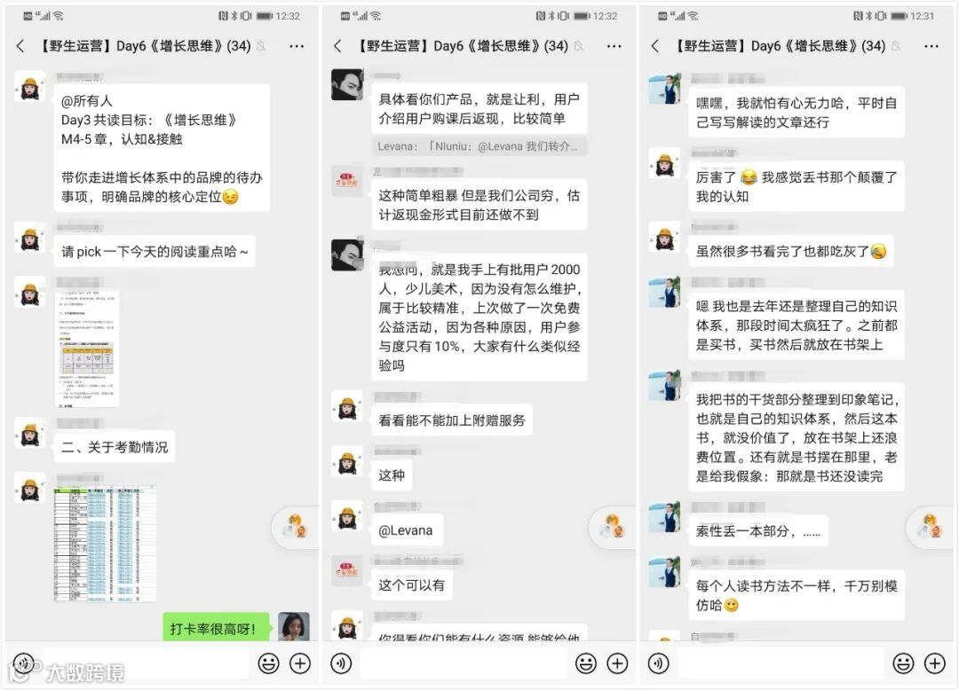 活动规则,依旧简单粗暴:7天共读一本好书,由领读人带读每日重点,连续每天写不少于300字读书笔记,活动结束后100元押金全额返还,另外每期最佳读书人获得惊喜实体书箱一个。给大家分享下本期的读书氛围,太棒了,不仅交流书,还把书的内容带进了自己的业务思考中: