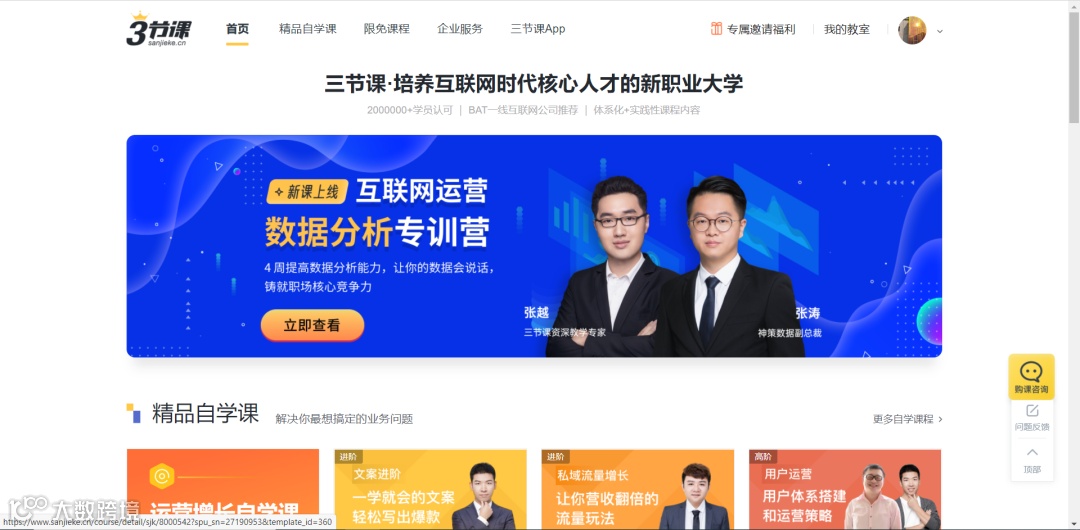 三节课:三节课的官网简洁明了一目了然,在头部banner会主推目前新上线的课程【这里找不到之前自己报名的训练营课程,可能只通过社群渠道进行推课动作】,同时会搭配竞品自学课程。在页面的最后也会增加名企背书。