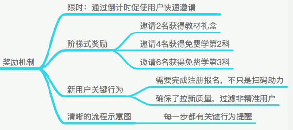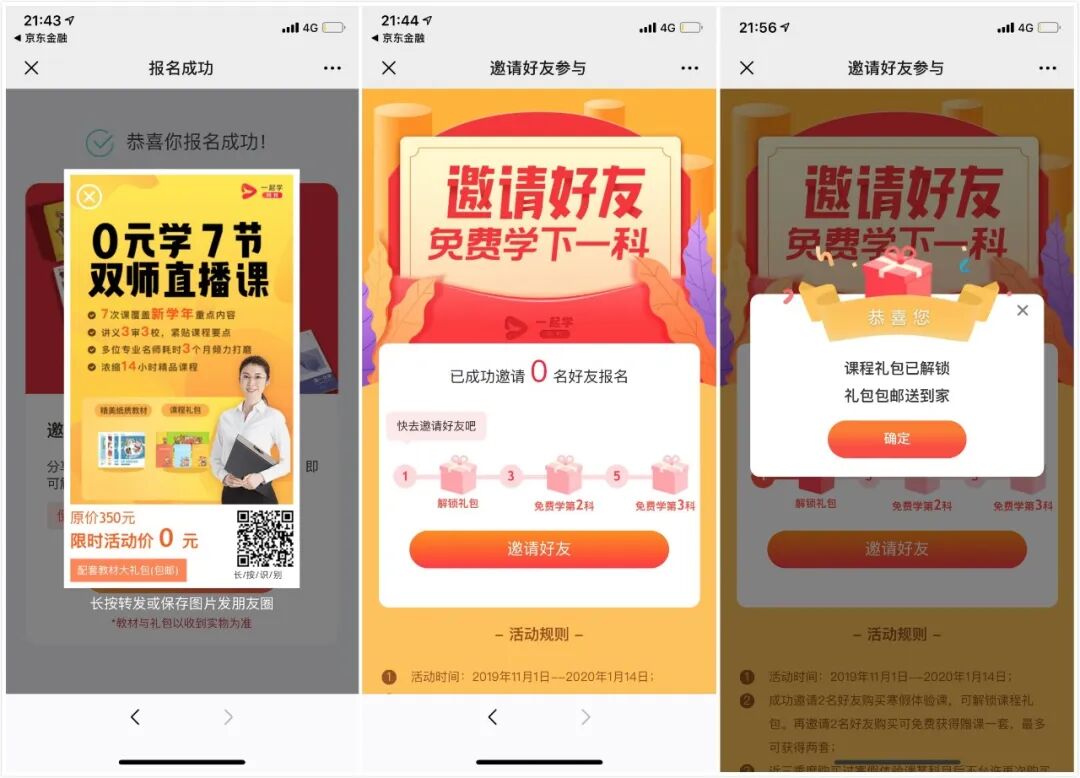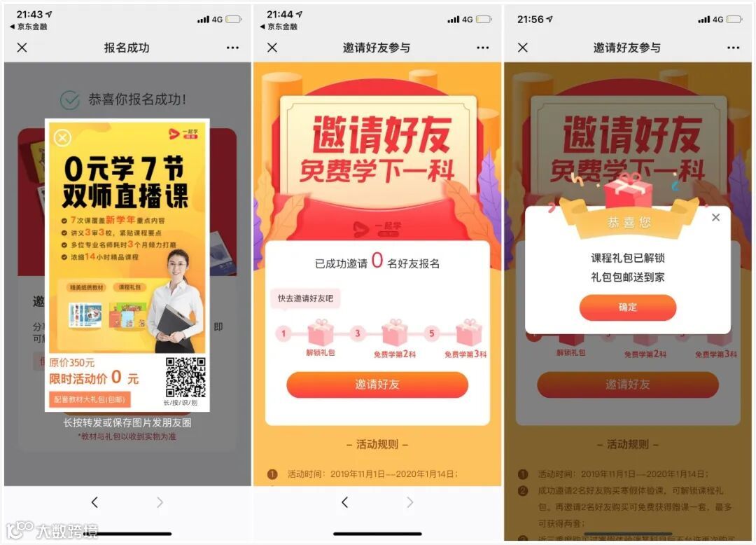 以上三项关键行为都可以通过AB测试不断去调试,找到其中的平衡点。比如邀请奖励机制,应该设置为多少位好友;海报的文案、突出的利益点应该是什么才能提高打开率;落地页的利益点是有价值的课程服务还是精美的实物礼品。这些都可以通过测试去积累数据,从而优化活动的转化率。