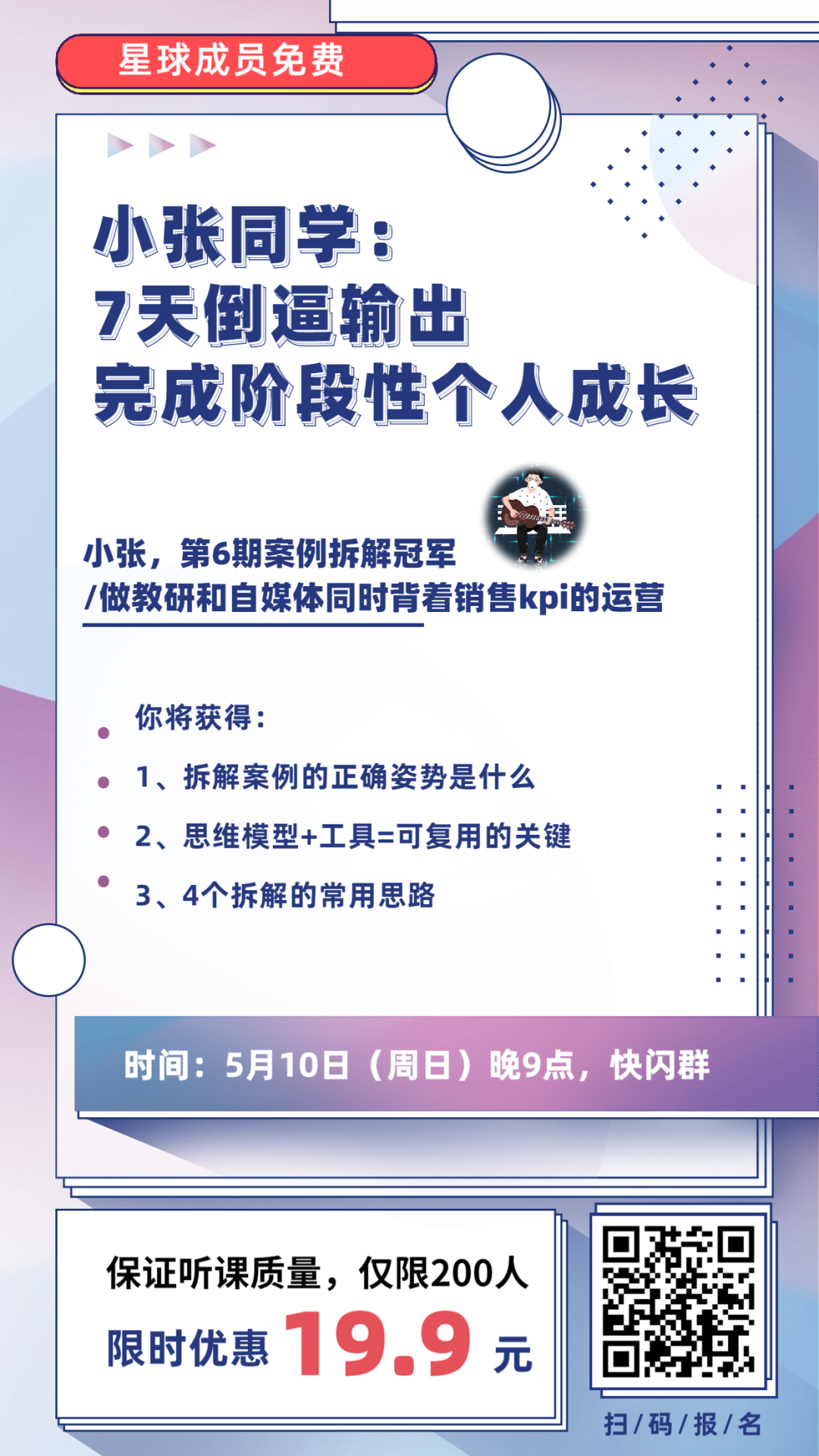本周的分享活动来啦,第 6 期案例拆解冠军小张同学,和大家分享《7天倒逼输出,完成阶段化个人成长》,报名截止至5月10日晚18点,过期报名不拉群,扫码报名: