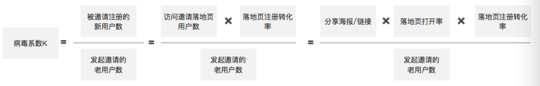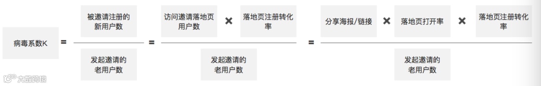 从公式中可以发现病毒系数和「发起邀请的老用户数」是负相关的关系,和「分享海报」「落地页打开率」「落地页注册转化率」是正相关的关系。