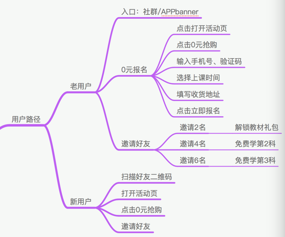 用户路径分析分为老用户和新用户流程,主要差异在于活动触发方式不同,老用户主要从APP内的弹窗、运营位、公众号推文、社群助教推送链接接触到该活动;新用户主要通过老用户分享的海报扫码参与。