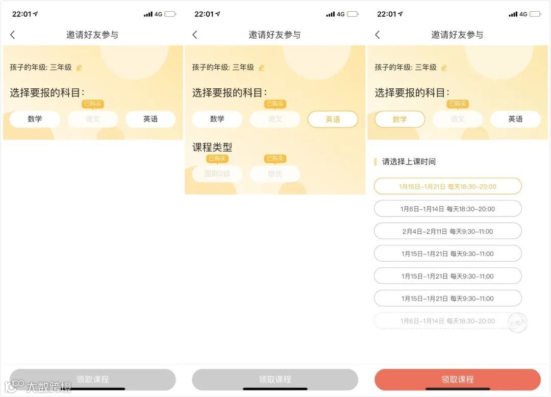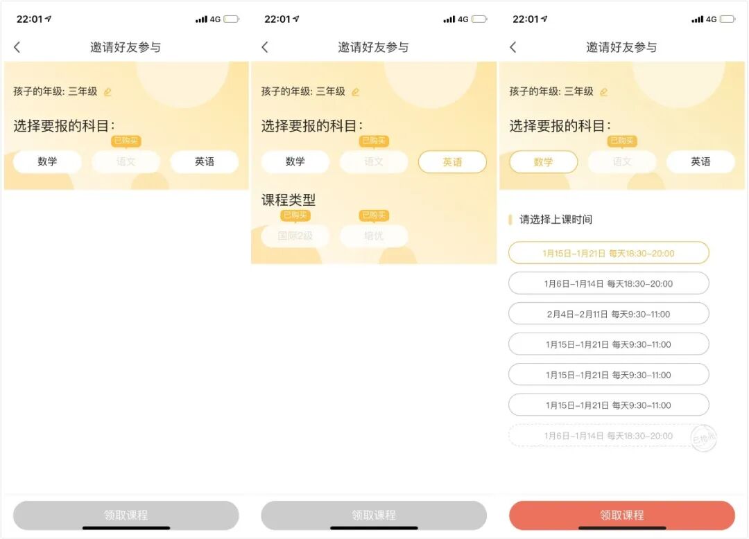 在选择科目和课程时会标记你已购买的课程,避免用户重复领取同一节课